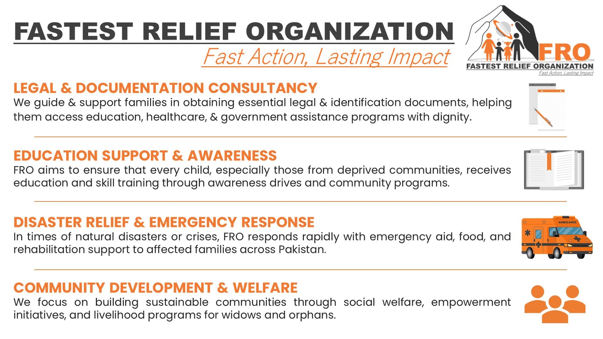 Fastest Relief Organization (FRO) is a humanitarian and social welfare initiative dedicated to delivering swift, transparent, and impactful services to communities across Pakistan. Our mission is to bring hope, support, and empowerment to individuals and families in need through consultancy, education, relief, and development programs.